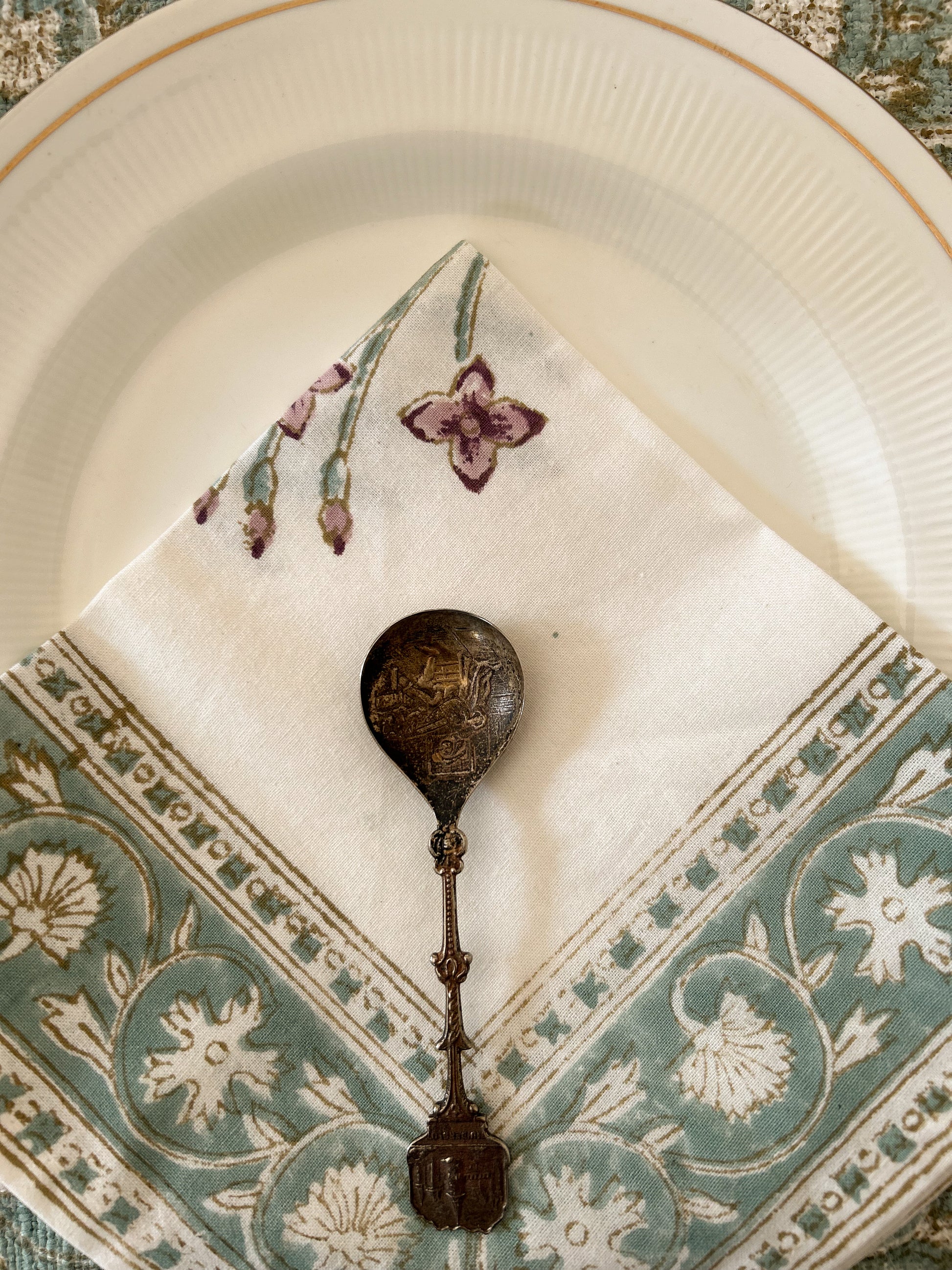Hand block printed 100% cotton napkins with organic jute-linen mats & runner. Created by and sourced from the artisans of Sanganer, Rajasthan.